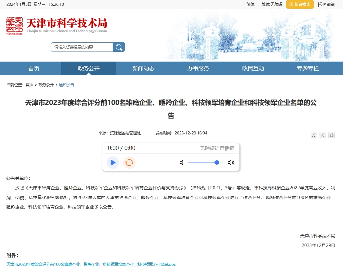 2023年12月29日,天津市科學(xué)技術(shù)局發(fā)布《天津市2023年度綜合評分前100名雛鷹企業(yè)、瞪羚企業(yè)、科技領(lǐng)軍培育企業(yè)和科技領(lǐng)軍企業(yè)名單的公告》。